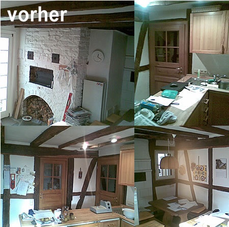 | Aufgabe: | Planung und Fertigung einer Einbauküche in einem alten, sehr verwinkeltem Fachwerkhaus mit den für diese Objektart typischen Besonderheiten. Die von den Bewohnern sehr geliebte Sitzecke sollte auch in der neuen Planung verwirklicht werden. |