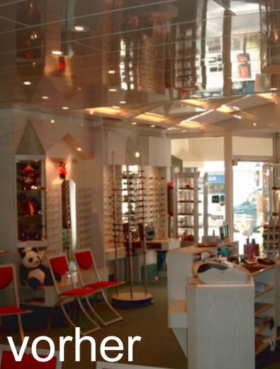 Komplexe Ladengestaltung, französischer Nussbaum, Akzente in Edelstahl, Leuchtwände in satiniertem Glas.